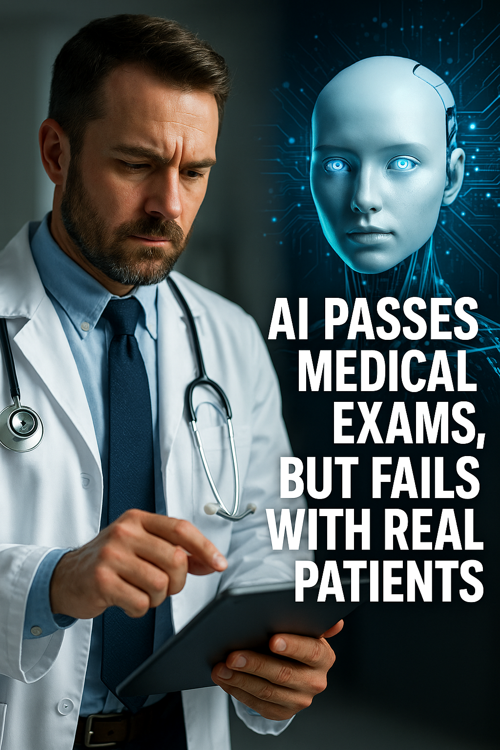 A doctor consults a tablet while an AI avatar looks on. Text on image highlights a key concern: AI aces medical tests, but falters with real patients.