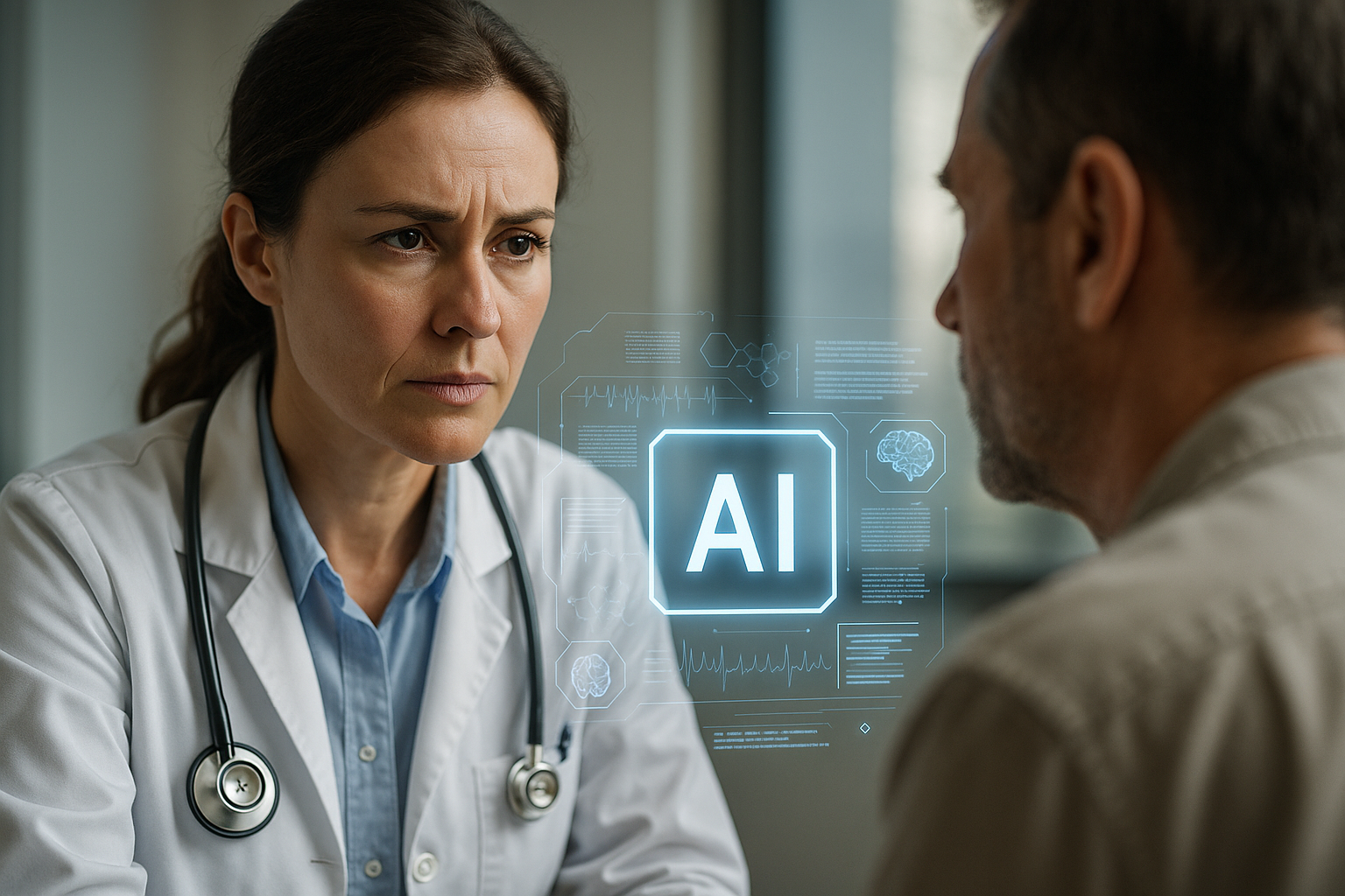 A physician faces a patient with concern, underscoring the challenge of empathy under time pressure (AI icon signifies tech’s growing presence).
